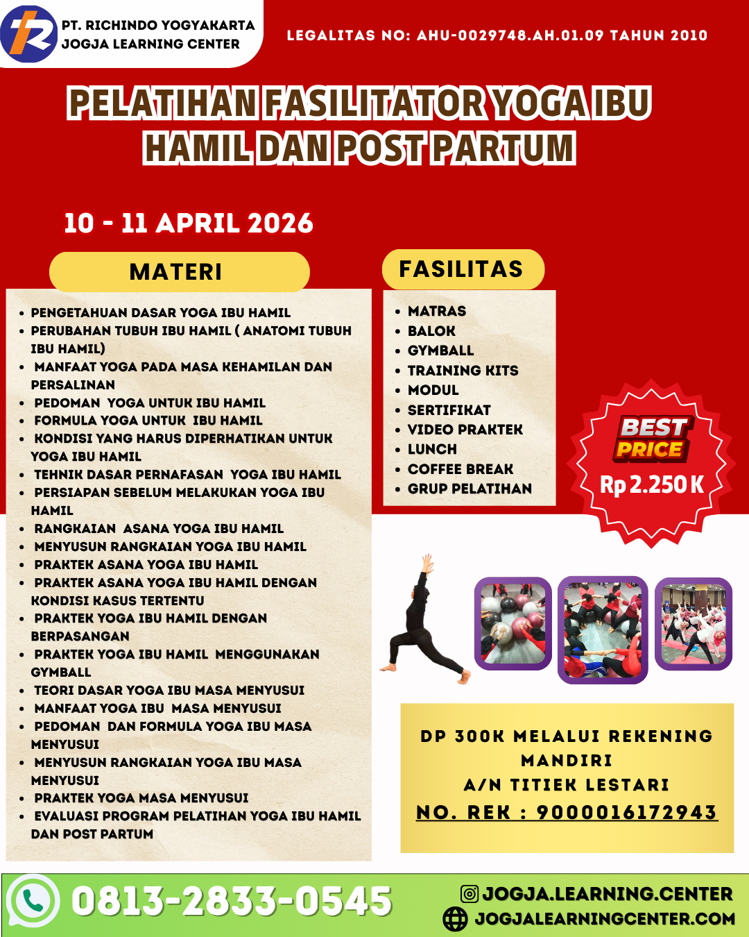 PT. Richindo Yogyakarta membuka kelas untuk menjadi Fasilitator Yoga Ibu Hamil dan Post Partum batch April 2026 Pelatihan ini di rancang untuk memberikan pengetahuan dasar dan mendalam kepada peserta Mengenai Asana Yoga yg dapat diterapkan untuk ibu Hamil dan masa menyusui. Sehingga setelah mengikuti pelatihan ini peserta bisa membuka kelas Yoga untuk Ibu Hamil dan kelas Yoga Ibu Post Partum Masa Menyusui . Pelatihan batch April akan di laksanakan di Tgl 10-11 April 2026 Tujuan pelatihan adalah mengajarkan kepada peserta untuk menjadi Fasilitator Yoga yg memahami tehnik dasar Yoga yang benar Aman dan nyaman utk Ibu hamil dan Post Partum di masa menyusui Ikuti! ✨ Pelatihan untuk menjadi Fasilitator Yoga Ibu Hamil dan Post Partum ✨ ☘️ Terbuka untuk Nakes & Masyarakat Umum Materi yang kami berikan sangat kompleks, mulai dari Basic knowledge tentang yoga serta anatomi tubuh hingga berbagai praktik Asana yoga ibu hamil dan post partum yang bisa membantu ibu hamil menjalani kehamilan dengan lancar aman.nyaman dan minim trauma, serta dibekali dengan 20 % Teori, dan 80 % Praktik. Dan dilengkapi evaluasi & post test, kami menjamin anda menjadi Fasilitator Yoga yang handal dan sukses. Info lengkap & registrasi : 📲 WA : 0813-2833-0545 📲 ig : @jogja.learning.center 📲website : www.jogjalearningcenter.com ===================================== #pelatihanyoga #pelatihanyogahamil #pelatihanyogaibuhamilyogyakarta #puskesmas #klinikbidanpraktekmandiri #sekolahtinggikesehatan #bidanperawatcantik #yogaibuhamil #pelatihanyogaprenatal #prenatalyoga #pelatihanprenatalyoga #prodikebidanan #kesehatanibuanak #yogakesehatan #fasilitatoryogaibuhamil #fasilitatorprenatalyoga #sekolahkesehatanyogyakarta #yogabumilsurabaya #prenatalyogasumateraselatan #prenatalyogasumatera #prenatalyogateacher #prenatalyoga #prenatalyogajakarta #prenatalyogajakartatimur